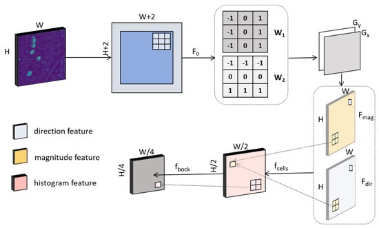 is a cell composed of 2 × 2 pixels, where represents the pixel index within cell . denotes the magnitude corresponding to the pixel in fmag. is the feature channel index associated with the angle value in fdir for that pixel. represents a unit sample function.