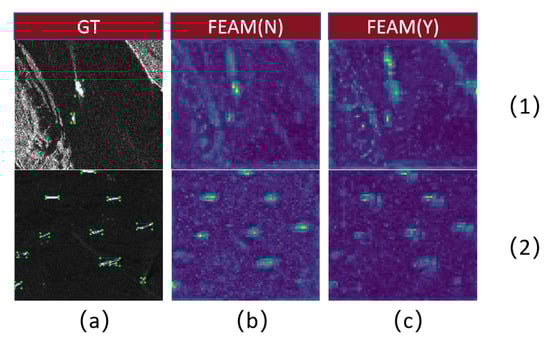 - Visualization results for the BSTEM: By enhancing the contrast between the target and the background, the BSTEM enables the network to focus on more stable and meaningful image features, effectively reducing the impact of redundant features generated by clutter interference on target detection. Figure 6 illustrates the feature maps outputted by the backbone network, where (a) represents the annotation information of the input image, (b) represents the backbone feature map of the baseline network without the BSTEM, and (c) represents the backbone feature map of the DFENet model that includes the BSTEM. Images (1) and (2) were selected from the SSDD and HRSID, respectively. Among them, the visualization result for the feature map was obtained by taking the maximum value in the feature channel dimension. The visualized feature maps clearly demonstrate that the BSTEM effectively suppresses clutter interference from the ground in the detection of coastal vessels.