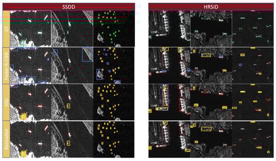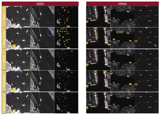 Visualization results of ship detection for offshore datasets in SSDD. Red boxes are real boxes, yellow boxes are missed detections, and blue boxes are false alarms.
