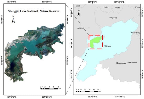 The Shengjin Lake National Nature Reserve is located in Dongzhi County, Chizhou city, Anhui Province, within the coordinates of 116°55′ to 117°15′E and 30°15′ to 30°30′N, covering a total area of 33,340 hectares [45], as shown in Figure 1. The Shengjin Lake area receives abundant rainfall and is rich in surface runoff, with well-vegetated surroundings. This wetland is a freshwater lake with high water quality and serves as a protected area focused on conserving freshwater wetland ecosystems and rare, endangered bird species [46]. An investigation of the dynamic changes in the landscape patterns of the Shengjin Lake wetland ecosystem is crucial for monitoring the ecological and environmental changes and maintaining the biodiversity. This study also provides important insights for wetland conservation management and the rational utilization of wetland resources. Therefore, we select Shengjin Lake as the study area to conduct an in-depth investigation of wetland landscape classification methods and to analyze the evolution of landscape patterns from 2013 to 2023.