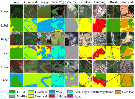 For sample preparation, to ensure the diversity and representativeness of the samples, typical ground landscape types under various imaging conditions were included. For the 11 years of image data from 2013 to 2023, several areas of approximately 5000 m × 5000 m were chosen to construct the samples. These areas encompassed the typical features of different categories, ensuring that each landscape category had sufficient and balanced samples. This study employed visual interpretation to construct sample label data, classifying the land types into nine categories: forest, grassland, water, aquatic vegetation, mudflat, farmland, building, road, and bare land. The dataset consisted of 6579 images (1024 × 1024 pixels), which were randomly split into training, testing, and validation sets at a 3:1:1 ratio. Ultimately, the Shengjin Lake Wetland Gaofen Image Dataset (SLWGID) was constructed.