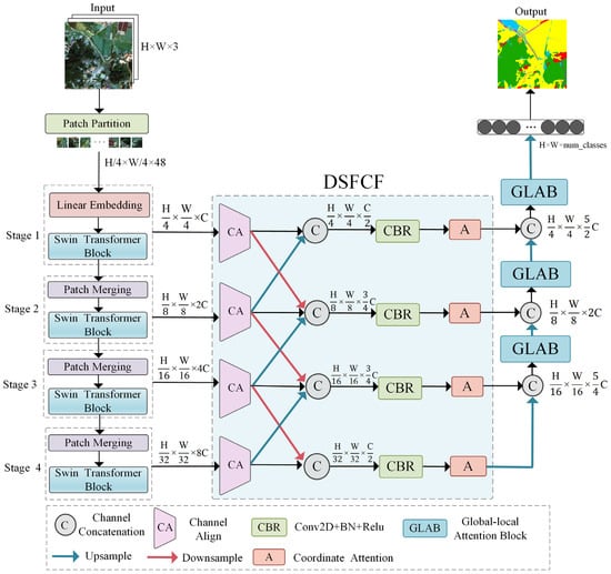 In the Swin Transformer encoder, the feature levels extracted at different stages reflect varying representations. Shallow features have a smaller receptive field and typically provide fine-grained information such as edges, shape contours, textures, and positions, whereas deep features, with a larger receptive field, encompass more abstract contextual semantic information. During feature fusion, the significant semantic gap between deep features and shallow features can cause semantic confusion [47]. Therefore, in this study, a deep–shallow feature cross-fusion (DSFCF) module is designed to integrate multi-scale features and mitigate this semantic gap.