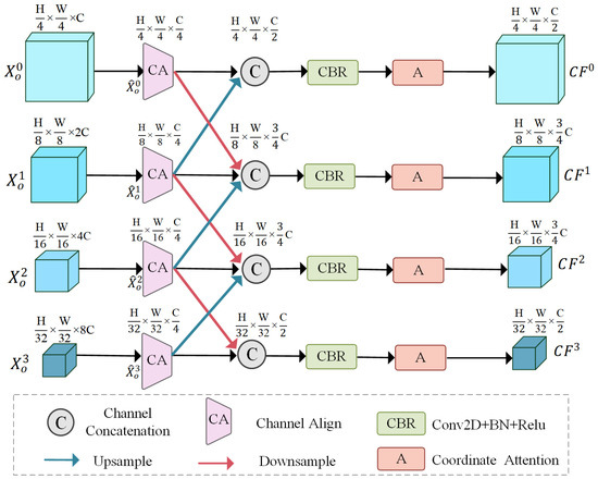 where represents the features of the current branch, and and represent the feature maps from the previous and subsequent levels, respectively. denotes the feature concatenation operation; refers to the 3 × 3 convolution, BatchNorm, and ReLU operations; represents the coordinate attention mechanism; and indicates the result of the cross-fusion of features across different levels.
