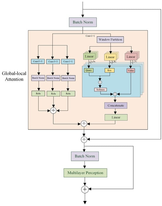 High-resolution images contain much spatial and spectral information, with rich details on the texture and shape of ground objects. However, the complexity of these object features increases, leading to segmentation errors due to phenomena such as “different objects with the same spectrum” and “same object with different spectra” [49]. To better capture both global contextual feature distributions and local, multiscale structural details and to enhance the ability of the model to learn interclass differences and intraclass consistency, a global–local attention block (GLAB) is introduced in the model decoder. As shown in Figure 5, the GLAB consists of a local branch composed of multiscale convolutions and a global branch based on windowed multihead self-attention mechanisms, which extract local detail information and global spatial dependency semantic features, respectively. The local branch employs convolutional groups with kernel sizes of 5 × 5, 3 × 3, and 1 × 1 to capture spatial and spectral features at different scales, thereby fully extracting fine-grained local features, and can be represented as:
