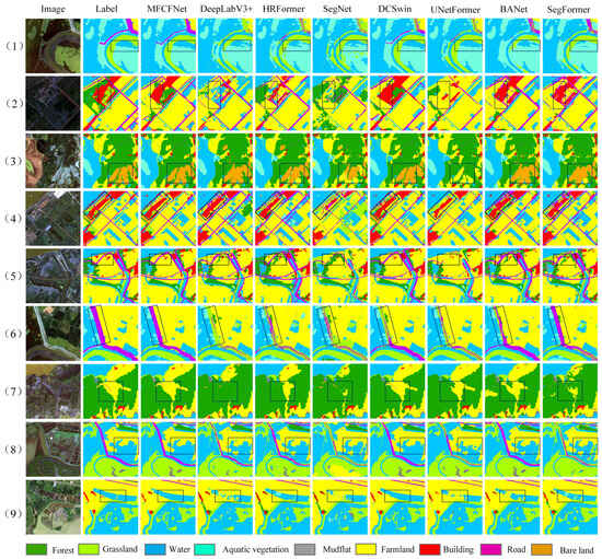 The proposed MFCFNet is evaluated against seven typical semantic segmentation models (DeepLabV3+ [23], SegNet [50], HRFormer [51], UNetFormer [52], SegFormer [53], BANet [54], and DCSwin [55] on the SLWGID. The comparison results of the models are quantitatively assessed, with Table 3 and Table 4 presenting the overall and category-specific evaluation metrics for each model. Compared to the other models, MFCFNet achieves higher mIoU, mF1, and OA values on SLWGID, with scores of 78.12%, 87.05%, and 93.23%, respectively. In the segmentation results for various categories, MFCFNet records the highest IoU and F1 scores for eight categories, excluding forest. SegNet aggregates multiscale features but struggles with interclass similarities and intraclass differences, leading to subpar performance in fine category segmentation. In comparison, MFCFNet achieves significantly higher F1 scores and IoUs for all categories, with the exception of the forest category. Compared to DeepLabV3+, MFCFNet, with DSFCF and GLAB, improves both overall and detailed semantic extraction, achieving a 10.23% increase in the mIoU and a 7.89% increase in the mF1 score. Models such as SegFormer, HRFormer, UNetFormer, and DCSwin incorporate attention mechanisms to establish global dependencies, increasing the aggregation of global and local semantic information. Although they outperform earlier CNN-based methods, their categorywise segmentation accuracy still lags behind that of MFCFNet.