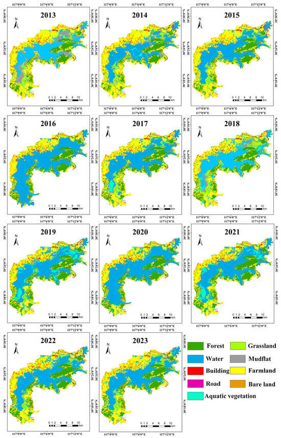 Landscape classification results for Shengjin Lake National Nature Reserve from 2013 to 2023.