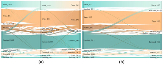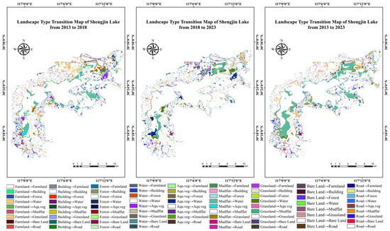 The landscape type transfer matrix quantifies area conversions between different landscape types, showing changes in direction and extent [56]. To analyze the dynamic transfer of landscape types in Shengjin Lake, we created landscape type transfer maps for the periods 2013–2018, 2018–2023, and 2013–2023, as shown in Figure 9. We conducted a transfer matrix analysis, visualizing the results as a Sankey diagram (Figure 10). Additionally, we statistically analyzed the transfer area and direction, as well as the transfer out rate and transfer in rate for each type from 2013 to 2023, with the landscape type transfer matrices presented in Table 7.