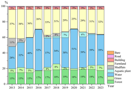 The analysis of changes in landscape type area is key to analyzing the dynamic changes in landscape patterns [57]. We calculated the area of each landscape type from 2013 to 2023 and summarized the results in an area proportional change chart, as shown in Figure 11. The Shengjin Lake area is dominated by water, farmland, and forest, with smaller areas of grassland, mudflats, buildings, roads, and bare land. The forest area remained relatively stable, increasing slowly from 15% in 2013 to 19% in 2019. This change was related primarily to the “Grain for Green” policy, which resulted in a corresponding decrease in the proportion of farmland area. However, from 2020 to 2023, the forest area slightly decreased to 17% because some mountain forests were excavated and transformed into bare land. The changes in the farmland, mudflat, and grassland areas were significantly influenced by the seasonal water level changes. The area variations in these three types were closely related to the changes in water area, which tended to decrease as the other type increased. When the water area increased, mudflat and grassland areas decreased because, during high water levels, grasslands, mudflats, and some lakeside farmlands could become submerged. Notably, in 2016 and 2019, the proportion of water exceeded 50% due to the image collection times in these two years coinciding with extreme precipitation events that rapidly increased the water level. Consequently, the area of water significantly increased, submerging large areas of grassland, mudflat, and lakeside farmland, leading to a decrease in the area proportions of these three types. The reduction in farmland area was influenced by the transformation of some farmland into ponds for aquaculture. The area proportions of roads and buildings remained relatively small and stable over the 11 years.