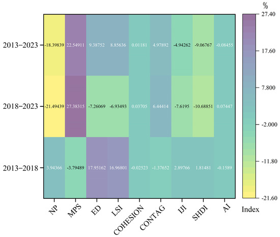 Landscape-level indices can comprehensively describe the overall changes in the landscape patterns in a study area [59]. We calculate the landscape-level indices for the years 2013, 2018, and 2023, and the results are presented in Table 9. Additionally, we analyze the changes in landscape indices during 2013–2018, 2018–2023, and 2013–2023, as shown in Figure 12.