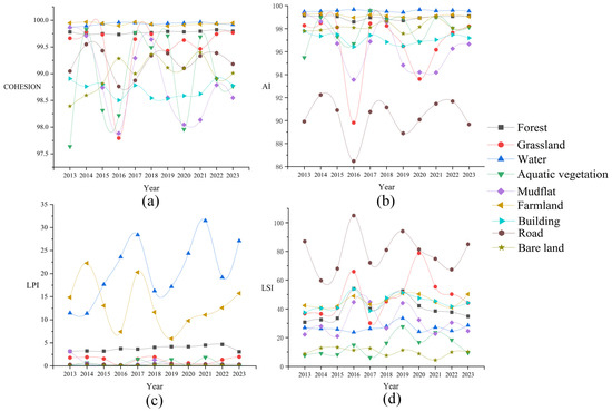 Changes in the landscape-type-level index from 2013 to 2023: (a) COHESION; (b) AI; (c) LPI; (d) LSI.