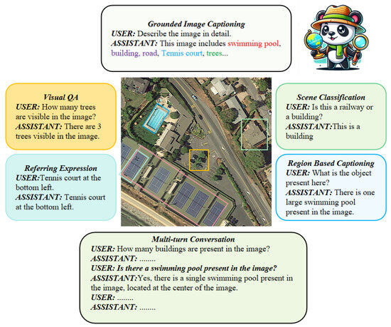 - Kuckreja, K.; Danish, M.S.; Naseer, M.; Zhang, Z.; Zhao, T.; Guo, Y.; Liu, F.; Chen, D.; Guan, Z.; Zhang, T.; et al. GeoChat: Grounded Large Vision-Language Model for Remote Sensing. In Proceedings of the IEEE/CVF Conference on Computer Vision and Pattern Recognition (CVPR), Seattle, WA, USA, 17–21 June 2024; IEEE: New York, NY, USA, 2024; pp. 27831–27840. [Google Scholar]