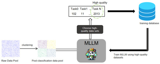 To address this gap, we proposed a novel, adaptive fine-tuning algorithm for multimodal large models, capable of automatically categorizing and filtering remote sensing multimodal instruction datasets to identify high-quality data for training from massive remote sensing datasets. The core steps of the algorithm include projecting the large-scale data into a semantic vector space and using the MiniBatchKMeans algorithm for automated clustering. Each data cluster was then processed by introducing perturbation parameters to the original data and calculating the translational differences between the original and perturbed data in the multimodal model’s vector space. This difference served as a generalization performance metric, determining the quality of the dataset. Finally, through a layer of ranking, we selected the batch of datasets with the highest generalization performance metrics for training.