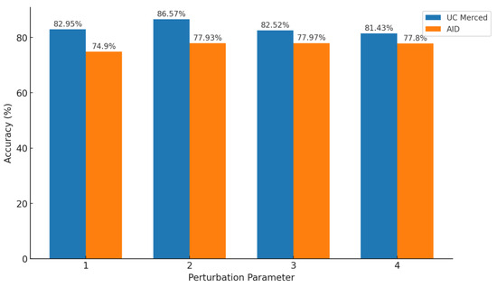 Therefore, we set the optimal disturbance parameter to 2. To further verify this, we used our algorithm to rank the generalizability of the training set with disturbance parameters from 1 to 4. We selected the top 5000 entries with the highest generalizability for training and evaluated the performance on the UC Merced and AID datasets. The results are shown in Figure 7.