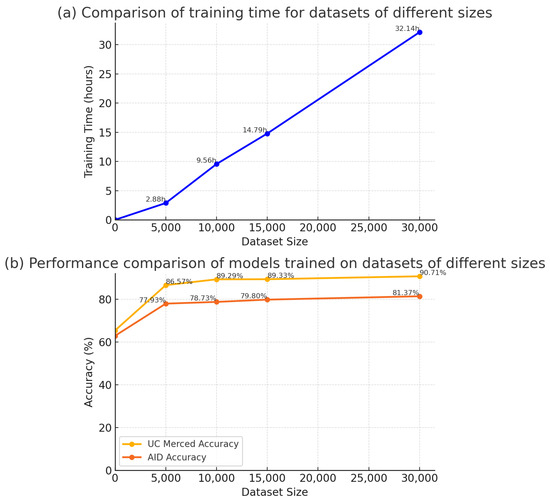 From the figure, the model achieved the best training performance when the disturbance parameter was set to 2, reaching 86.57% accuracy on the UC Merced dataset—4 percentage points higher than with a parameter of 1 or 3. On the AID dataset, it attained 77.93%, only 0.04 percentage points below the peak value at n = 3. Additionally, we conducted experiments on two other clusters of 25 K and 90 K entries. Using our algorithm, we selected 5 K samples from each cluster for training. The evaluation results in Table 2 and Table 3 confirmed that, with n = 2, the models achieved optimal performance on RSVQA-LR, AID, and UC Merced. Overall, the model’s best training performance was obtained when the disturbance parameter was set to 2.