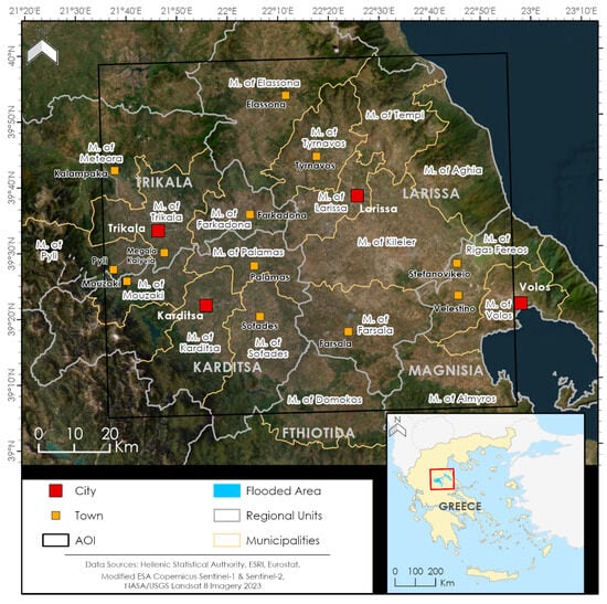 Area of study. Map produced using data from the Hellenic Statistical Authority, ESRI, Eurostat, modified ESA Copernicus Sentinel-1 and Sentinel-2, and NASA/USGS Landsat 8 Imagery 2023.