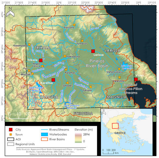 The AOI, shown in Figure 1, is located in the region of Thessaly in Greece (NUTS2). It includes the Regional Units (NUTS3) of Larissa, Karditsa, Trikala, and Magnissia, while a small part belongs to the Regional Unit of Fthiotida of the Central Greece Region. The main cities in the area are Larissa, Volos, Trikala, and Karditsa, while other important towns also exist. Regarding the population, considering the municipalities within the AOI according to the latest 2021 census [36], it is 662,390. This area includes the biggest plain in Greece, the Thessaly Plain, a large agricultural area mainly consisting of permanently irrigated land. This plain is split into two parts (sub-basins), the eastern in Larissa and the western in Trikala-Karditsa. In terms of hydrology (Figure 2), it has high water demands for irrigation, and it belongs to the Pineios River Basin, which is the largest and the most important river in the region that drains into the Aegean Sea. The Pineios River has many major tributary rivers that flow into it at western Thessaly, including, e.g., the Enipeas, Kalentzis, and Lithaios. At the same time, the area has three important reservoirs: Lake Plastiras, Lake Smokovo, and Lake Karla, with the latter being in the southeastern part of the plain. Lastly, the area is a tectonic sink characterized by a flat topography mainly consisting of fluvial and alluvial deposits, and mountains surround it [37,38,39,40].