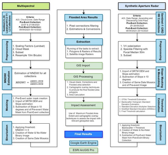 Firstly, the AOI was imported, and then two collections of multispectral images were created based on the AOI, date range, specific tiles, orbit, path, and row, which cover the area, cloud cover percentage, and the needed spectral bands. The first collection refers to cloud-free tiles of the pre-event state (22 July and 21 August 2023), while the second applies to the post-event state covering a period from the first available post-event image acquisition to when the area drained (8 September 2023–30 October 2023). Also, a list of dates and images was created to record the size of the collections. The next step involved the preprocessing of the collections, which included applying scaling factors for Landsat 8/9, applying a cloud mask and subset, and then resampling to 10 m with the bicubic method. After the preprocessing, a visual inspection of the collections was conducted.