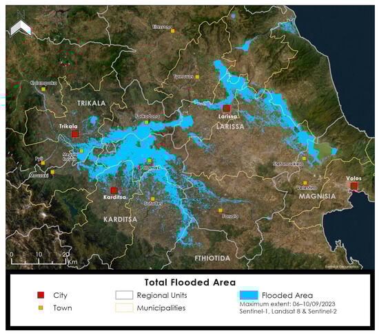 Total flooded area of 2023 Storm Daniel in Thessaly. The map illustrates the total flooded area derived from the analysis of Sentinel-1, Landsat 8, and Sentinel-2 satellite images from 6 to 10 September 2023.