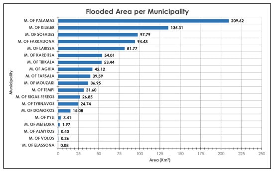 To further understand the distribution of flooded areas, which were existent across five regional units, as illustrated in Table 3, the most affected are the regional units of Karditsa with 398.37 km2 or 41.96% and Larissa with 355.21 km2 or 37.41%. It is also important to examine the impact at the municipal level, as presented in Table 4 and Figure 5. A total of nineteen municipalities were affected, with the municipality of Palamas being heavily struck by the floodwaters because the Pineios, Kalentzis, and Enipeas rivers are within the municipality’s boundaries, resulting in 209.62 km2 and over half of its total area (54.86%) being flooded. The municipality of Kileler is the second most affected (135.31 km2) and is located in the area of Lake Karla reservoir, which was extensively flooded. The municipalities of Sofades and Farkadona follow, with 94–97 km2 flooded, being significantly affected due to the Enipeas and Pineios rivers accordingly.