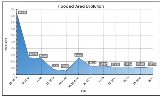 The final steps included the application of the threshold to the later MNDWI images, their binarization to flooded and non-flooded areas, and the generation of mosaics for each acquisition date. The final products were created by removing falsely classified pixels, filtering redundant pixels, narrowing the extent, and calculating the flooded area in square kilometers (km2). Then, the extraction for each date was followed by applying the corresponding functions, which were used to extract the flooded area rasters and vectors, MNDWI rasters, and the original natural and false-color images.
