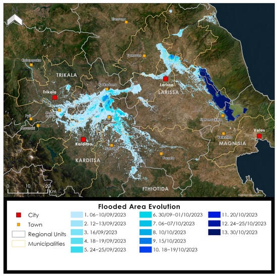 - Falaras, T.; Diakakis, M.; Lagouvardos, K.; Lekkas, E.; Parcharidis, I. Confluence of Operational Tracking of Flood Events in Western Thessaly’s Basin (Greece) in September 2020 Based on Subsequence of Optical and Radar Copernicus Satellite Imagery. In Proceedings of the 8th International Conference on Civil Protection and New Technologies—Safe Greece 2021, Athens, Greece, 24–26 November 2021. [Google Scholar] [CrossRef]