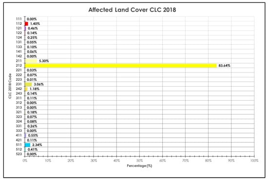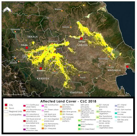 Land cover information for the impact assessment of the flooded areas was retrieved from Corine Land Cover 2018 (CLC 2018) in vector polygon format from the vector geodatabase openly available from the Copernicus Land Monitoring Service (CLMS) [63]. The CLC program dates back to 1990, with the most recent available dataset in a six-year update, the CLC 2018, while it retains the same standards across this timespan. The CLC provides sufficient detail, with three levels of detail reaching the 44 land cover classes at Level 3, the most analytical one. It also has an accuracy of ≥85% with a 25-hectare Minimum Mapping Unit (MMU) and a 100 m Mapping Minimum Width (MMW) [63,64,65]. In this study, it is used to map the land cover of the affected flooded areas.