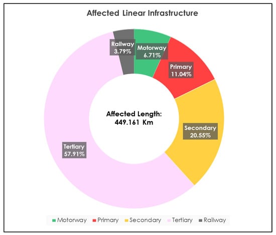 It is important to note that the GHS raster layer was converted to vector polygon format for the calculations. The Microsoft Bing ML Global building footprints were edited, excluding footprints with areas less than 15 m2, which were filtered out because they mostly represent small structures or are falsely classified as buildings. Also, structures classified as buildings, including greenhouses and solar panels, were removed after visual checking to improve the accuracy of the results. In its final form, this dataset includes the affected houses, buildings, and structures; warehouses; barns; and stables that are considered building footprints. For the linear infrastructure, the polyline vectors were used based on the category and type of the infrastructure. To accurately represent reality, buffers were created to intersect with the flooded area and estimate the affected road and railway length. More analytically, in the case of railways, which are standard gauge (1.435 m) [87] in the AOI, the buffer has an estimated width of 3 m, while for the road network, after advising the Road Works Design Directives of Greece (RWDD) [88] and basemap measurements, the buffers were set: (a) motorways 16 m (8 m per direction), (b) primary 8 m (4 per lane), (c) secondary 7 m (3.5 per lane), and (d) tertiary 6 m (3 m per lane).