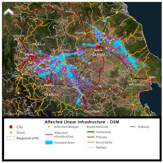 Geospatial vector data regarding the transportation linear infrastructure of the flood-affected area and the streams and rivers were obtained from OpenStreetMap (OSM). OSM is a community-built database that maintains geospatial information contributed around the world, with the data being open and freely available for everyone to use. The OSM data were retrieved from the Geofabrik download server, utilizing the available historical archive for the infrastructure [66,67].