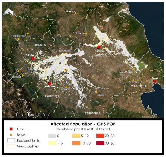 Lastly, datasets openly available from the Hellenic Statistical Authority—ELSTAT [36] regarding the area of interest were utilized, including the administrative boundaries and the recent population data of the 2021 Census. Additionally, the 2020 population grid from the Copernicus Global Human Settlement Layer [76] (GHS-POP R2023A) was used to assess the population affected by the flood. This 100 m × 100 m raster grid provides the estimated number of people per cell, representing the spatial distribution of the population, as derived from a combination of census and other related datasets [77].