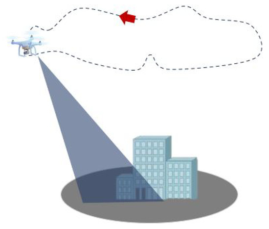 Multi-aspect SAR data collection configuration. The red arrow marks the direction of flight.