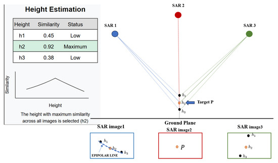 To evaluate the plausibility of various candidate heights, we calculate the similarity between the reference point p and the projection points in each secondary image. A similarity measure is defined to represent the degree of matching, which can be based on image patch correlation, mutual information, or other measures suitable for SAR image characteristics.