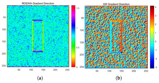 Figure 7 shows the comparative effects of the ROEWA operator and GR operator in processing simulated SAR images containing rectangular targets shown in Figure 6a. In Figure 7a, the gradient map calculated by the ROEWA operator fails to effectively distinguish between the two opposite edges of the rectangular target. Despite these edges being in different spatial positions, in the gradient map of the ROEWA operator, these two parallel edges exhibit similar gradient values. This leads to ambiguity in edge representation, making it difficult to differentiate between different structural features.