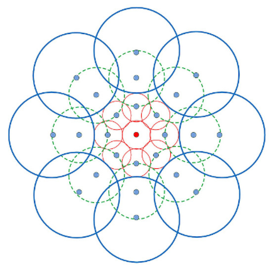 Figure 8 shows the sampling structure of the DAISY method, which uses a polar grid composed of circular regions at three scales. Unlike the square sampling grid in SIFT, the DAISY method computes weighted sums of directional histograms within these circular regions. The pooled features are combined to form the final vector. In Figure 8, the ‘•’ markers represent the centers of circular pooling regions where gradient pooling is performed. The polar grid enables efficient rotation and interpolation, with increasing radii ensuring complete directional coverage.