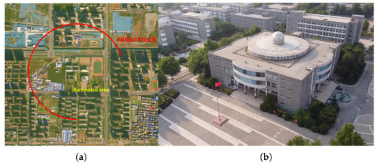 The acquisition followed a circular flight pattern at approximately 500 m altitude with a radius of around 1000 m. Due to the drone’s limited onboard storage, we collected data from only about 75% of the planned circular path. The target area was positioned about 200 m from the flight path’s center, with the radar illuminating a region approximately 100 m in diameter. Our proposed algorithm works effectively with data collected along various curved trajectories, not just perfect circles. Figure 10b displays the target area—a school campus in Henan province, China, with the radar spot center being a four-story teaching building featuring a square base.
