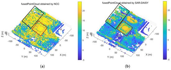 As shown in Figure 16a,b, the visual comparison reveals obvious differences between the two methods. The SAR-DAISY method (Figure 16b) produces well-defined building outlines, clear structural boundaries, and consistent height distributions across the scene. Particularly notable improvements are visible in two key regions (highlighted by black and red boxes): the building in the upper left corner displays distinct structural outlines with SAR-DAISY while NCC is almost completely overwhelmed by noise, making it impossible to identify the main structure, and the central building shows accurate height distribution with SAR-DAISY versus inconsistent height values with NCC. Additionally, other areas in Figure 16b, such as vegetation regions, have also been successfully recovered and are consistent with the optical image. In contrast, the NCC-based point cloud (Figure 16a) exhibits substantial noise, randomly distributed mismatched points, and fragmented structural features. The comparison demonstrates that when processing multi-angle images containing complex structures or repetitive patterns, where features vary with aspect angle, intensity-based matching methods struggle significantly.