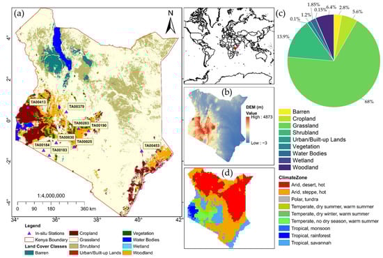 The map shows the geographic span of the proposed study area, Kenya. Land use land cover and in situ data distribution (a); digital elevation model (DEM) (b); land use coverage (%) (c); climate zone (d). Note: The land use land cover map was obtained from MODIS land cover data for the year 2022, DEM was derived from a Shuttle Radar Topography Mission (SRTM) of 90 m, and climate zone was obtained from Koppen–Geiger climate classification for 1991–2020 at 1 km resolution.