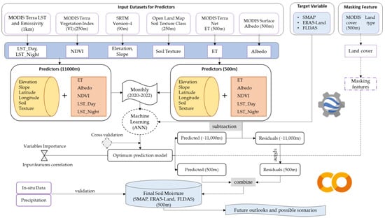 This study utilized comprehensive input variables mainly comprising NDVI, ET, LST day, LST night, surface albedo, elevation, slope, and soil texture directly accessed from GEE to downscale multi-source data, which have the capability to capture SM variability.