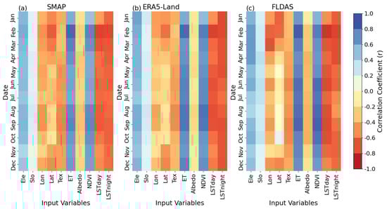The input variables’ correlation coefficient values with corresponding SM datasets. SMAP (a); ERA5-Land (b); FLDAS (c). Note: The input variables were interpreted as follows: Ele—elevation, Slo—slope, Lon—longitude, Lat—latitude, Tex—soil texture, ET—evapotranspiration, LST_Day and LST_Night—land surface temperature during day- and nighttime, respectively.