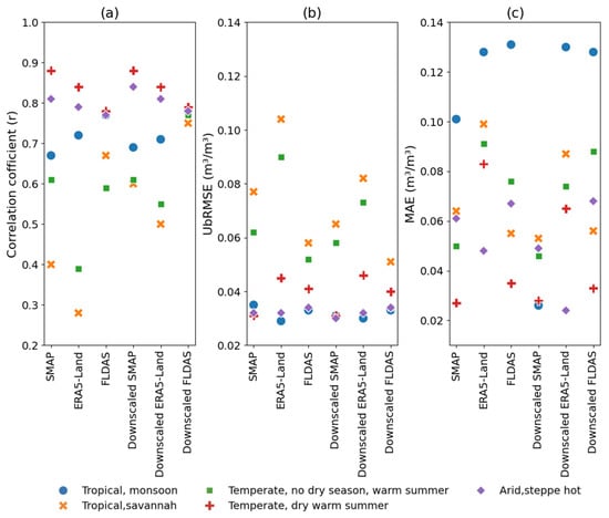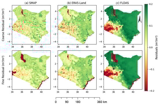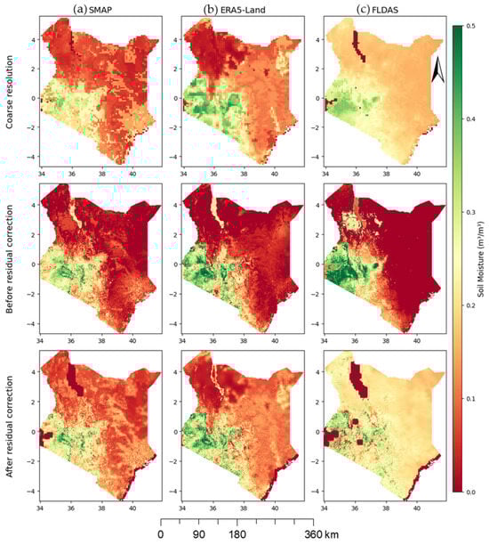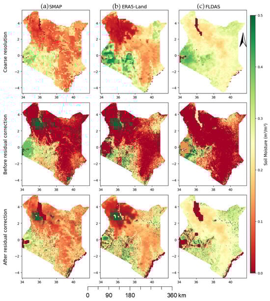 The coarse resolution SM datasets presented in Figure 8a–c and Figure 9a–c derived from SMAP, ERA5-Land, and FLDAS exhibit similar spatial trends and distribution of SM, although differences in magnitude are evident. Variations are particularly noticeable in areas such as water bodies, which are initially masked out in some of the datasets (i.e., FLDAS), as seen in the northern and western regions of Kenya, where water bodies are prominent.