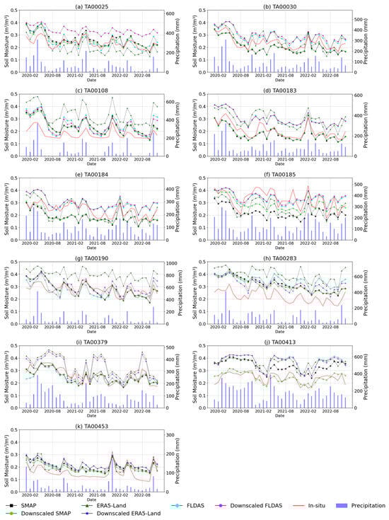 Several studies have suggested that SM has a predominantly positive influence on precipitation [24,80]. In this study, we analyzed the temporal patterns of both the original and downscaled datasets at station locations where in situ data are available. Additionally, we utilized monthly precipitation data retrieved from Climate Hazards Center Infrared Precipitation with Station data [81] to examine the SM patterns along with precipitation. Figure 10a–k demonstrates that both the original and downscaled datasets generally exhibit trends consistent with the trends observed in the in situ data, albeit with varying magnitudes. This indicates the importance of leveraging multiple datasets to achieve a comprehensive understanding of SM dynamics. The SM levels tend to fluctuate throughout the year, with noticeable increases corresponding to months with higher precipitation, particularly in April and November. Among the datasets analyzed, FLDAS and its downscaled counterpart show consistently higher SM values, as illustrated in Figure 10a,b,d–f,j,k. This suggests that FLDAS tends to predict an elevated SM level across most stations when compared to SMAP and ERA5-Land.