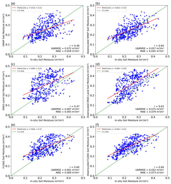 Notably, the downscaled SM datasets tend to show a closer relationship with the in situ SM observations and monthly precipitation patterns compared to their original counterparts. This indicates that the downscaling process enhances the datasets’ sensitivity to precipitation changes by improving spatial resolution, which allows for the capture of a more localized variation in SM driven by precipitation. Overall, the SM datasets demonstrate strong responses to precipitation events, showing an increasing trend during or shortly after precipitation occurs.