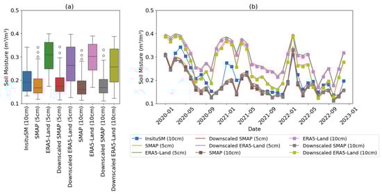 Moreover, ERA5-Land is a reanalysis dataset that integrates model and observation data across the world to provide a reliable view of the changes in land variables [12]. In contrast, FLDAS is a dataset comprising many climate-related variables, such as SM, and designed to assist food security (i.e., drought monitoring) assessments in data-sparse, developing countries [46]. To generate high-resolution SM maps that provide detailed spatial variability and are suitable for various agricultural and hydrological applications, SMAP L4 and ERA5-Land are aggregated every month, complementing the FLDAS dataset.