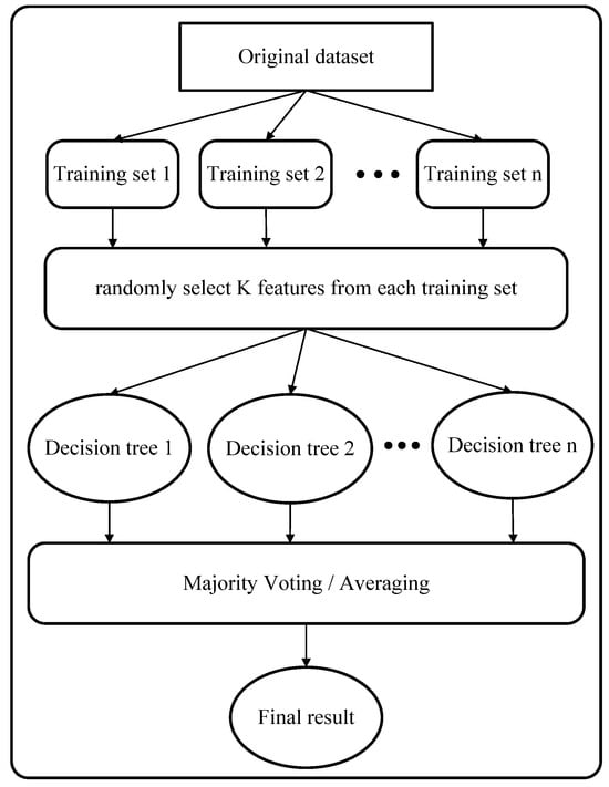 The RF algorithm is an ensemble learning algorithm based on decision trees, which uses bootstrap aggregating to combine multiple decision trees into a forest to predict the results. Bootstrap aggregation, also known as bagging, is an algorithm that trains a weak learner by reselecting multiple new datasets on the original dataset through sampling with replacement []. This method divides the original dataset into n new training sets, constructs a weak learner on each new training set, and integrates the results of these n weak learners using majority voting (for classification problems) or averaging the output of each weak learner (for regression problems) to obtain the result. The weak learners in the RF are decision trees, which can be classified into classification trees and regression trees, depending on the type of dependent variable data, and the type of decision tree determines whether the RF is used for classification or regression. RF is simple to implement, has high accuracy and strong generalization ability. The introduction of randomness makes it less likely to fall into overfitting, and has a certain ability of anti-noise. In addition, because each decision tree can be generated independently and simultaneously, the algorithm is faster and easier to parallelize than other machine learning algorithms. Figure 1 shows the flowchart of the RF algorithm. The algorithmic workflow of the RF method proceeds as follows:
