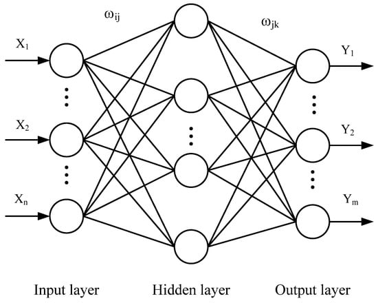 In Figure 2, X1, X2, …, Xn are the input values of BPNN, Y1, Y2, …, Ym are the output values of BPNN, ωij and ωjk are the weights of BPNN, respectively, and BPNN expresses the function mapping relationship from n independent variables to m dependent variables. The algorithmic workflow of the BPNN is as follows: