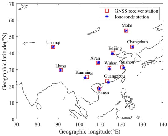 To estimate foF2 and MUF(3000)F2 by TEC, the selection of stations requires GNSS receiver stations to be as close as possible to the corresponding ionosonde stations so that we can obtain the minimum error when building the machine learning model. We select stations based on the criterion that the great circle distance between GNSS receiver stations and their corresponding ionosonde stations is less than 1.5° []. Then, a total of 11 GNSS receiver stations and 11 corresponding ionosonde stations are selected.