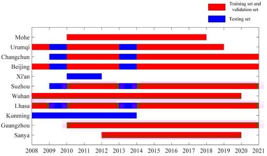 The dataset used in this study cover years longer than one solar cycle (2008–2020). Detailed information of ionosonde stations and corresponding GNSS receiver stations is listed in Table 1. All data of Xi’an station and Kunming station and the data of the other five stations (Urumqi, Changchun, Beijing, Suzhou and Lhasa) from 2013 (high solar activity year) and 2009 (low solar activity year) are used as the test set to evaluate the performance of the machine learning models, and the other data are used to train the model. The training data are divided into the training set and the validation set. The validation set consists of 20% of the data randomly selected from the training data, which is used to test the model configuration and assist in building the model, and the remaining data are used as the training set. Figure 4 shows the time span of the training data and the test data. The training data contains the training set and the validation set.