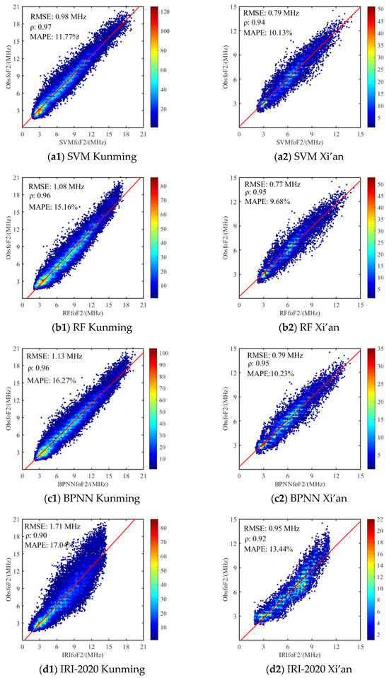 In this section, the performances of the three machine learning models are evaluated. And the IRI-2020 model is used as a reference model. Figure 6(a1,b1,c1,d1) present the results of observation and the machine learning model at Kunming station, and Figure 6(a2,b2,c2,d2) present the results at Xi’an station. The vertical coordinate ObsfoF2 denotes the foF2 observations, the horizontal coordinates SVMfoF2, RFfoF2, and BPNNfoF2 denote the foF2 estimations of the three machine learning models, respectively, and IRIfoF2 denotes the foF2 results of the IRI-2020 model, and the value of the colorbar denotes the number of samples.