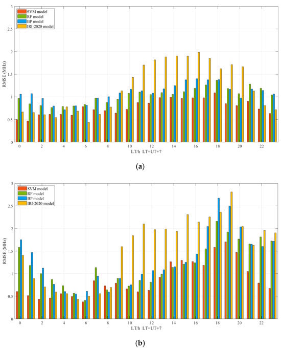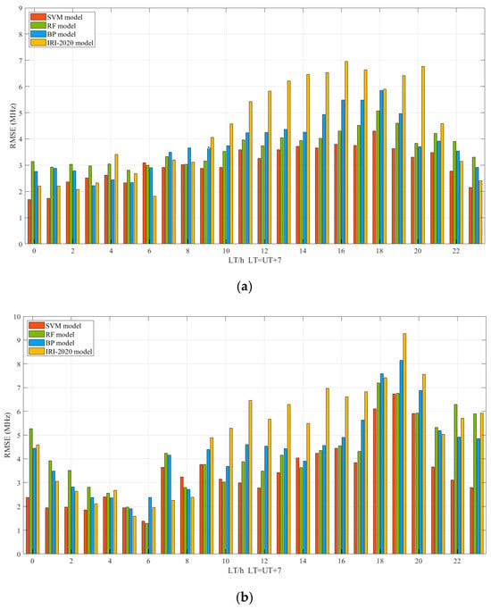 Figure 13a,b show the hourly MUF(3000)F2 RMSE values of the three machine learning models (SVM, RF, BPNN) and IRI-2020 model at Kunming station for low (2009) and high (2013) solar activity years. As seen from Figure 13a, the RMSE of the SVM model has a minimum of 1.69 MHz at 0 LT and has a maximum of 4.29 MHz at 18 LT. The RMSE of the RF model has a minimum of 2.80 MHz at 0 LT and has a maximum of 5.07 MHz at 18 LT. The RMSE of the BPNN model has a minimum of 2.22 MHz at 5 LT and has a maximum of 5.85 MHz at 18 LT. Thus, the RMSE of the three machine learning models varies with local time and the RMSE of the SVM model has the smallest value of the three models. Furthermore, the RMSE of the three machine learning models at 9 LT to 17 LT are obviously smaller than those of the IRI-2020 model.