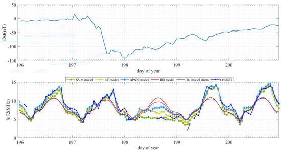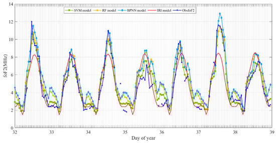Figure 14 shows the values of MUF(3000)F2 versus day of year obtained by the models of SVM, RF, BPNN, IRI, and observations at Kunming station, respectively, during the magnetically quiet days (1–7 February 2009). The discontinuity of the data in the figure is caused by the missing of foF2 observational data. As seen in Figure 14, the three machine learning models have comparable accuracy and the model results of MUF(3000)F2 are close to the observation results during the daytime when the MUF(3000)F2 values are larger, while the IRI-2020 model has a large bias. At night, when the MUF(3000)F2 values are small, the SVM model still captures the MUF(3000)F2 variation better than the RF and BPNN models. Overall, all the three machine learning models can represent the diurnal variation in foF2, and the SVM model performs best.