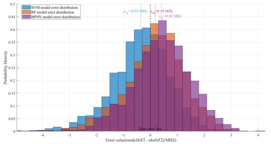 Figure 16 presents error distribution histograms for the three ML models during disturbed conditions, with the x-axis showing model–observation differences (MHz) and the y-axis representing probability density. The black dashed line indicates zero-error reference, while μA = −0.98 MHz, μB = 0.26 MHz, and μC = 1.54 MHz denote mean errors for SVM, RF, and BPNN, respectively. For a thorough assessment, Table 6 summarizes key statistics: mean error, standard deviation, skewness, kurtosis, and RMSE during storm events.